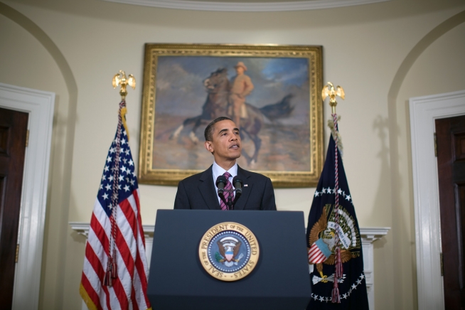 President Barack Obama remarks on the economy during a statement to the press in the Roosevelt Room of the White House,