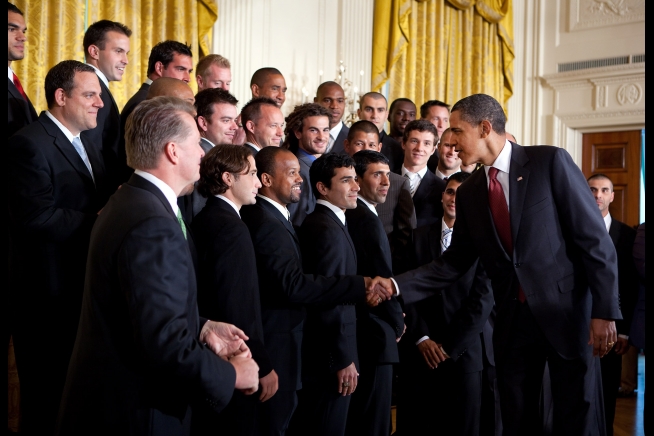 President Barack Obama greets team members during a ceremony honoring the Major League Soccer champion Real Salt Lake in the East Room of the White House.