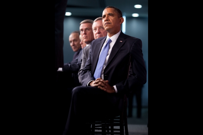 President Barack Obama, with, from left, Sen. Charles Schumer, D-N.Y., Sen. Patty Murray, D-Wash., Sen, Byron Dorgan, D-N.D., and Senate Majority Whip Richard Durbin, D-Ill., listen to remarks at the Democratic Policy Committee Conference at the Newseum in Washington, D.C., Feb. 3, 2010. (Official White House Photo by Pete Souza)