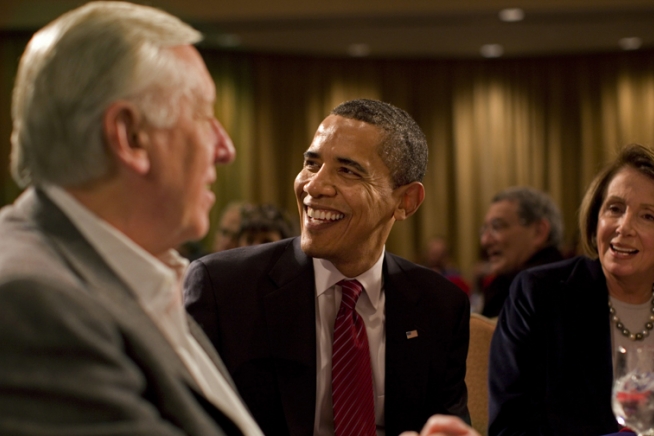 President Obama with House Majority Leader Steny Hoyer (D-MD) and House Speaker Nancy Pelosi (D-CA) at the House Democratic Caucus Issues Conference in Williamsburg, Virginia.