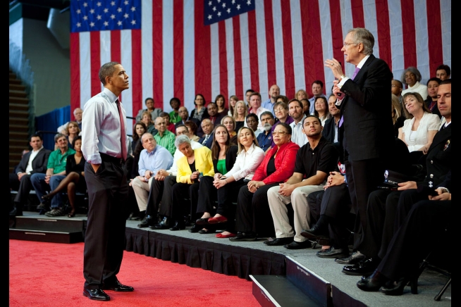 President Barack Obama listens as Senate Majority Leader Harry Reid speaks during a town hall meeting at Green Valley High School in Henderson, Nev.