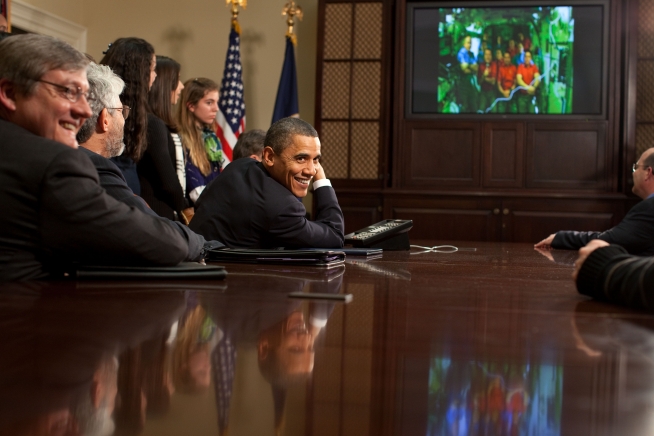 President Barack Obama, along with Congressional leaders and middle school children, congratulate astronauts aboard the International Space Station and the Space Shuttle Endeavour during a call from the Roosevelt Room of the White House, February 17, 2010. (Official White House Photo by Pete Souza)