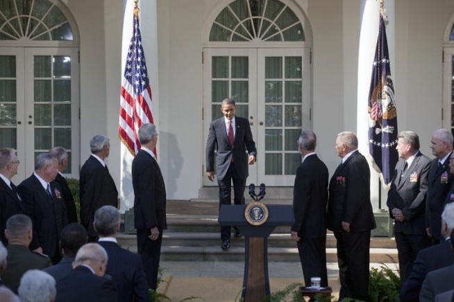 President Barack Obama prepares to deliver remarks during the Presidential Unit Citation Award presentation in the Rose Garden of the White House, Oct. 20, 2009.