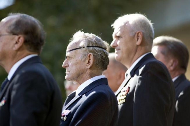 Members of Troop A, First Squadron, 11th Armored Combat Regiment of the U.S. Army stand behind President Barack Obama during the presentation of the Presidential Unit Citation Award in the Rose Garden of the White House, Oct. 20, 2009. Eighty-six Troop A veterans attended the ceremony honoring their exemplary service and personal sacrifice.