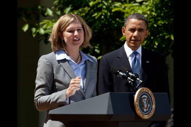 Sarah Brown Wessling, a high school English teacher at Johnston High School in Johnston, Iowa, accepts the 2010 National Teacher of the Year Award from President Barack Obama during a ceremony in the Rose Garden of the White House, April 29, 2010.