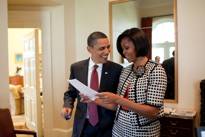 President Barack Obama shows First Lady Michelle Obama a letter he received from a young person, in the Outer Oval Office