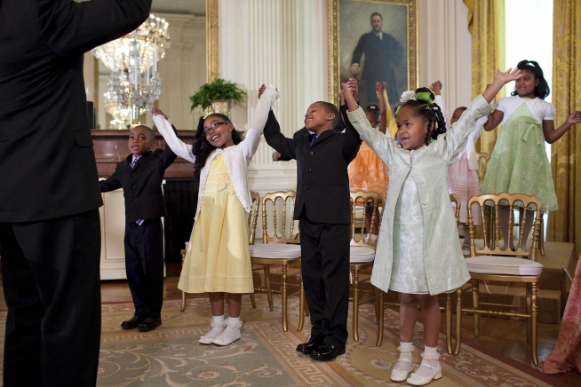 The Mount Ennon Baptist Church Children’s Chorus from Clinton, Md., performs at the Easter Prayer Breakfast in the East Room of the White House