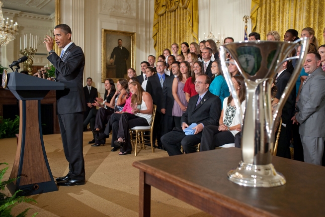President Barack Obama welcomes the Women's Professional Soccer champions Sky Blue FC in the East Room of the White House, July 1, 2010. The President honored their winning of the inaugural Women's Professional Soccer championship.