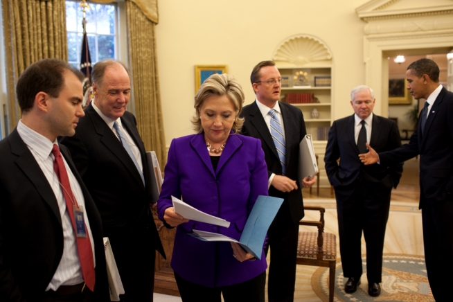 Secretary of State Hillary Clinton confers with Deputy National Security Advisor for Strategic Communications Ben Rhodes, and Deputy National Security Advisor Tom Donilon, as President Barack Obama talks with Press Secretary Robert Gibbs, and Secretary of Defense Robert Gates in the Oval Office, prior to the announcement of the New START Treaty