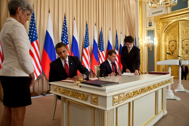 President Barack Obama and Russian President Dmitry Medvedev sign a preliminary agreement to reduce American and Russian nuclear arsenals after meetings at the Kremlin in Moscow, Russia
