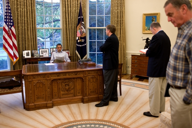 President Barack Obama meets with, from left, NSC Senior Director for Russian Affairs Mike McFaul, Deputy National Security Advisor Tom Donilon, and National Security Advisor Gen. Jim Jones, before a phone call with Russian President Dmitry Medvedev in the Oval Office