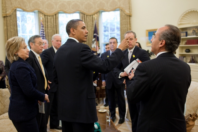President Barack Obama and Mexican President Felipe Calderón talk following their expanded bilateral meeting in the Oval Office
