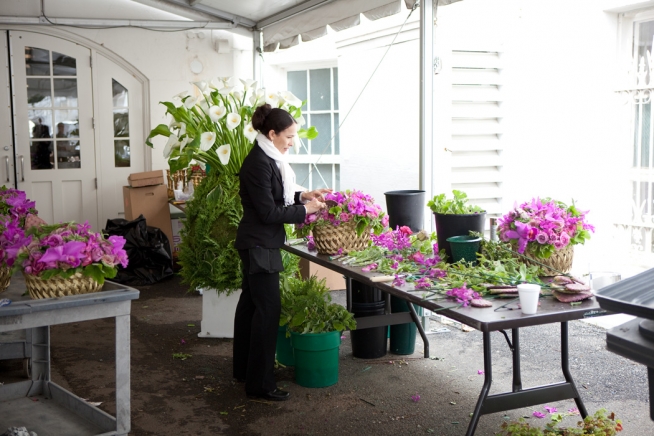 A contractor works on floral arrangements for the State Dinner honoring President Felipe Calderón of Mexico and his wife, Mrs. Margarita Zavala, in the East Tradesman Entrance of the White House
