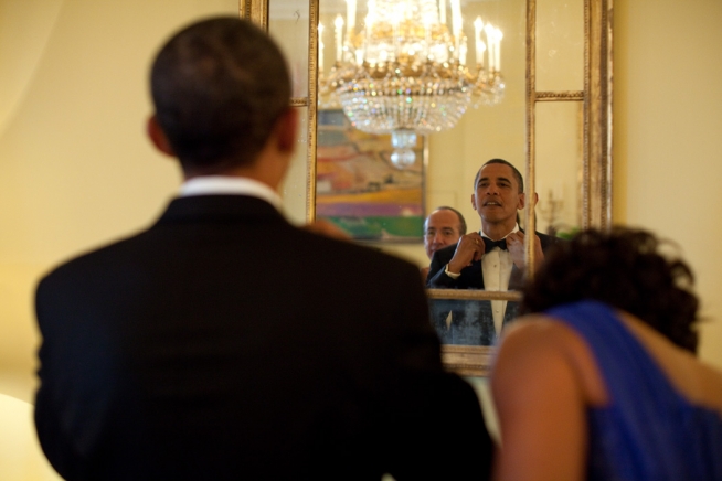 President Barack Obama adjusts his tie in the Yellow Oval Room of the White House, following a private reception in honor of President Felipe Calderón of Mexico and his wife, Mrs. Margarita Zavala