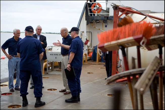 Vice President Joe Biden, Admiral Thad Allen, and Governor Christ are briefed on oil recovery efforts aboard the U.S. Coast Guard Cutter Oak at Pensacola Naval Air Station in Pensacola, FL,