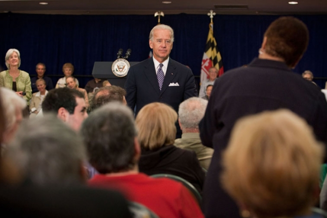 Vice President Joe Biden listens to a question from the audience during a healthcare town hall meeting at Leisure World in Silver Springs, Maryland, Wednesday, September 23, 2009. Also in attendance were Secretary of Health and Human Services Kathleen Sebelius, and Director of the White House Office of Health Reform Nancy Ann De Parle.
