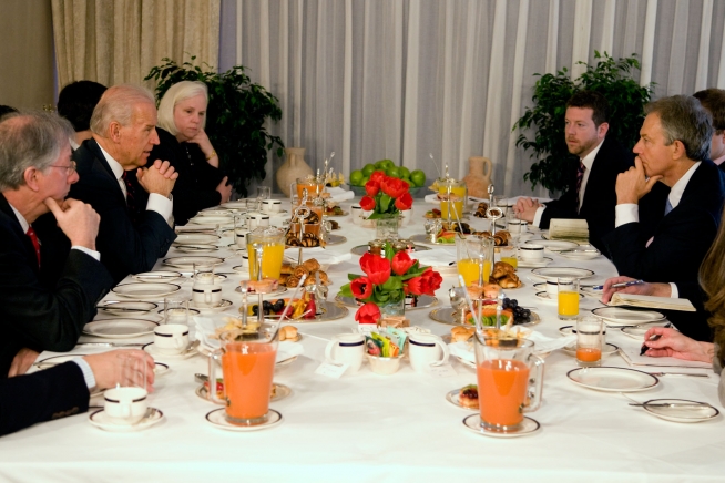 Vice President Joe Biden has breakfast with Former British Prime Minister Tony Blair at the David Citadel Hotel in Jerusalem, March 10, 2010. (Official White House Photo by David Lienemann)