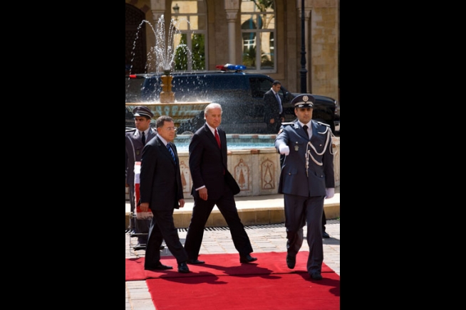 Vice President Joe Biden and Lebanese Prime Minister Fouad Siniora walk up the red carpet in the courtyard of the Grand Serail in Beirut, Lebanon, Friday, May 22, 2009.
