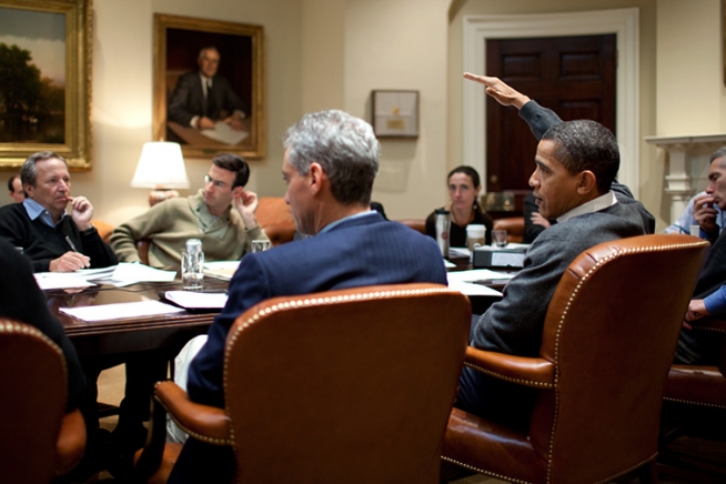 President Barack Obama makes his point to Lawrence Summers, left, head of the National Economic Council, and Office of Management and Budget Director Peter Orszag, seated next to Summers, during a Saturday budget meeting in the White House Roosevelt Room in the President's first week in office. Rahm Emanuel, White House Chief of Staff, is seated to the President's left.