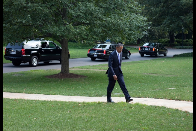 President Barack Obama returns to the Oval Office, after escorting President Mahmoud Abbas of the Palestinian Authority to his limousine, Sept. 1, 2010. (Official White House Photo by Pete Souza)