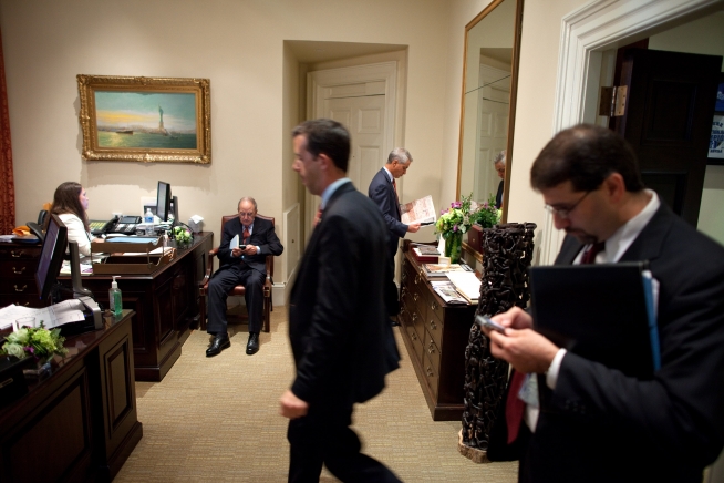 Brian Mosteller, deputy director of Oval Office operations, and Dan Shapiro, NSC senior director for the Middle East, enter the Outer Oval Office where George Mitchell, Middle East Envoy for Peace, seated, Chief Of Staff Rahm Emanuel, and personal secretary Katie Johnson wait for the President, Sept. 1, 2010 (Official White House Photo by Pete Souza)