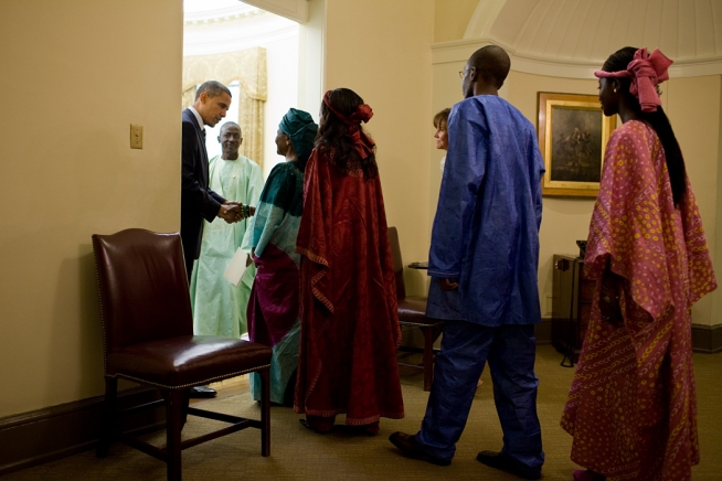 President Barack Obama greets Ambassador Alieu Momodou Ngum, of The Gambia, and his family before the start of an ambassador credentialing ceremony in the Oval Office, Aug. 10, 2010. The presentation of credentials is a traditional ceremony that marks the formal beginning of an ambassador’s service in Washington. (Official White House Photo by Pete Souza)