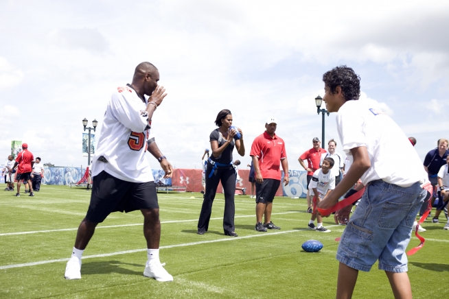 First Lady Michelle Obama prepares to throw the football during a "Let's Move!" launch event at Woldenberg Park in New Orleans, La., Sept. 8, 2010. (Official White House Photo by Samantha Appleton)