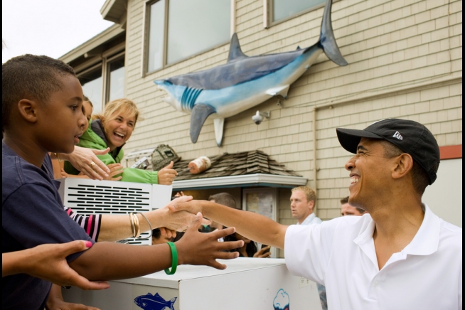 President Barack Obama greets people following lunch with First Lady Michelle Obama and daughters Sasha and Malia at Nancy's in Oak Bluffs, Mass., Aug. 25, 2010. (Official White House Photo by Pete Souza)