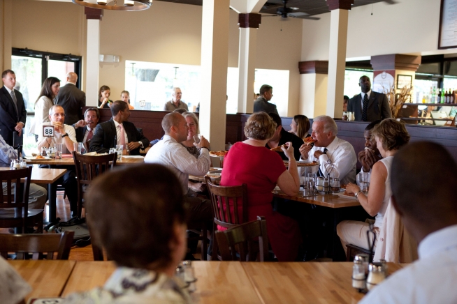 Vice President Joe Biden eats a slice of pizza while talking with with local workers and small business owners about the economy during a middle-class task force roundtable at Pete's New Haven Style Apizza restaurant in Washington, DC,