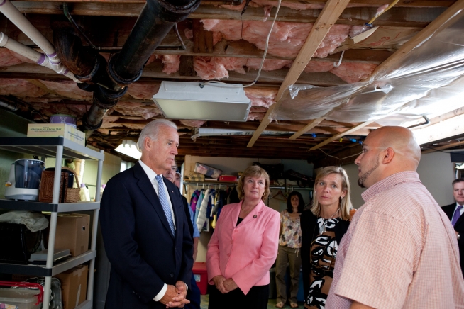 Vice President Joe Biden tours Lynn Dumont's basement and views some of the work being done on her home as part of the American Recovery and Reinvestment Act's weatherization program, in Manchester, New Hampshire. The Vice President was announcing that 200,000 homes have been weatherized under the program.