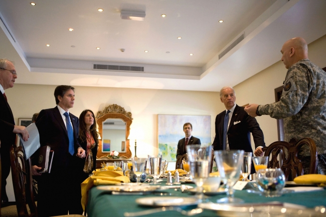 Vice President Joe Biden listens to Gen. Raymond Odierno, Commanding General, U.S. Forces-Iraq, at a breakfast with meeting UN Special Representative Ad Melkert, at U.S. Ambassador to Iraq Chris Hill's residence in Baghdad, Iraq, Jan. 23, 2010. (Official White House Photo by David Lienemann)