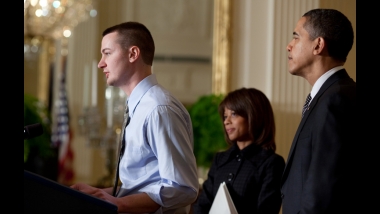 1:15: Travis Ulerick tells the assembled group that the time is now to reform our health system. He thanks President Obama for challenging him to get involved - he held a discussion in his community in January that grappled with the problems in our health system, and submitted suggestions for reforming the system to the President's health care team. Travis was one of over 30,000 Americans who held community discussions on health care over the holidays.