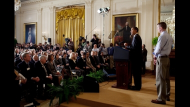 The President's Wrap-up Session3:50: It's another meeting of the health care minds in the White House Grand Foyer - We're all heading into to the East Room now. The President will join the full group shortly to recap what we discussed and achieved this afternoon.4:05: Everyone is seated - the President will enter any minute. This time the East Room is set up in a town hall style format, with seating on all sides of the podium. Sitting in the first row behind the President's podium are the 7 everyday Americans who hosted health care discussions in their hometowns.