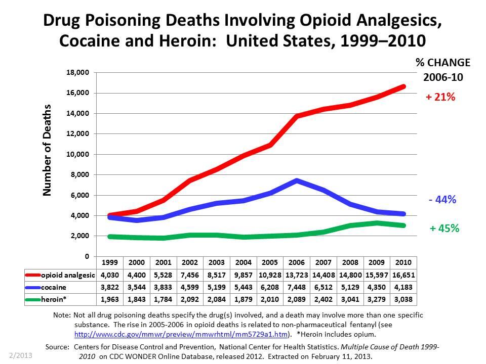 - More Americans are using and dying from prescription painkillers than from heroin. According to the Centers for Disease Control and Prevention (CDC), we've seen roughly a 20 percent increase in overdose deaths involving prescription painkillers since 2006. In 2010, there were over 16,000 drug poisoning deaths involving prescription painkillers. There were about 3,000 drug poisoning deaths involving heroin that same year.[1]