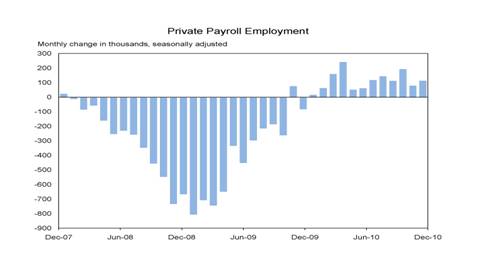 El informe laboral de hoy muestra que hubo un aumento de 113,000 empleos en planilla en diciembre, culminando 12 meses consecutivos de crecimiento que agregaron a la economía 1.3 millones de empleos en el sector privado durante el 2010, el mayor crecimiento en el sector privado desde el 2006. La tasa de desempleo disminuyó en 0.4 puntos porcentuales a 9.4 por ciento el mes pasado.